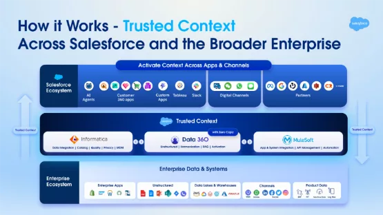 The acquisition positions Informatica within Salesforce’s Trusted Context layer, alongside MuleSoft. Tableau and Slack benefit as part of the Active Context layer, surfacing governed insights across Customer 360 apps.